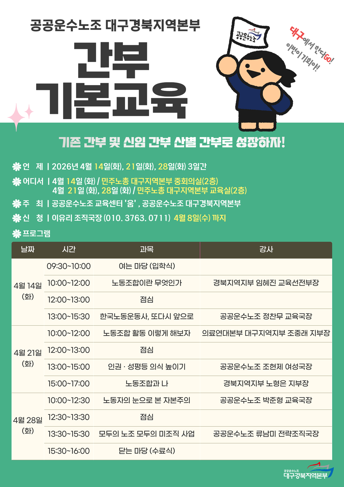 번호 과목명 강사 1 1. 노동조합이란 무엇인가 임혜진 2 2. 노동운동사: 또 다시 앞으로 정찬무 3 3. 노동조합 활동 이렇게 해보자 조중래 4 4. 인권·성평등 의식 높이기 조현제 5 5. 노동조합과 나 노형은 6 6. 노동자의 눈으로 본 자본주의 박준형 7 7. 모두의 노조, 모두의 미조직사업 류남미